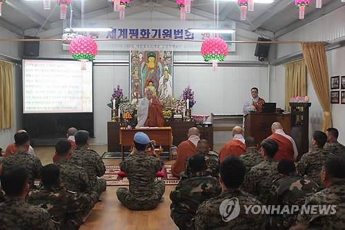 | △ 레바논 동명부대에서 열린 세계평화기원법회 (티르<레바논>=연합뉴스) 황희경 기자 = 1일(현지시각) 레바논 동명부대 내 법당인 호국동명사에서 열린 세계평화기원법회 모습. |