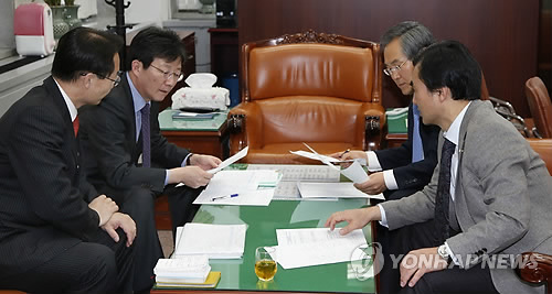 | △ 여야 원내대표 원내수석부대표 회동 (서울=연합뉴스) 이상학 기자 = 새누리당 유승민 원내대표와 새정치민주연합 우윤근 원내대표가 2일 오후 국회에서 회동을 갖고 김영란법 처리 등과 관련해 논의를 하고 있다. 왼쪽부터 새누리당 조해진 원내수석부대표, 유승민 원내대표, 새정치민주연합 우윤근 원내내표, 안규백 원내수석부대표. |