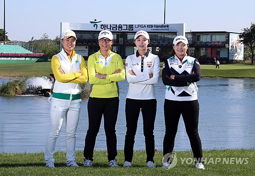 △ 사진은 2014년 10월 14일 인천 영종도 스카이72 바다코스에서 열린 LPGA 하나·외환 챔피언십 공식포토콜에서 선수들이 기념촬영을 하는 모습. 왼쪽부터 이민지, 리디아 고, 김효주, 장하나. 2014.10.14 << LPGA 하나·외환 챔피언십대회본부 제공 >> photo@yna.co.kr