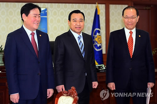 | △ 총리-부총리 협의회 (서울=연합뉴스) 전수영 기자 = 이완구(가운데) 국무총리가 3일 오전 서울 세종로 정부서울청사 총리집무실에서 열린 총리-부총리 협의회에서 최경환 경제부총리 겸 기획재정부 장관, 황우여(오른쪽) 사회부총리 겸 교육부 장관과 포즈를 취하고 있다. |