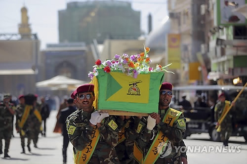 △ (AP=연합뉴스) 이라크 헤즈볼라 대원들이 2일(현지시간) 나자프에서 이슬람 극단주의 무장단체 '이슬람국가'(IS)와의 교전 중 사망한 동료의 장례를 치르고 있다. 이날 이라크군은 시아파 민병대, 수니파 부족 무장조직과 합동으로 IS가 장악한 티크리트와 일대 주요 도시를 탈환하는 작전을 개시해 교전을 벌였다. Iraqi Hezbollah fighters carry the coffin of their comrade, Ali Mansour, who his family says was killed in Tikrit fighting Islamic militants, during his funeral procession, in the Shiite holy city of Najaf, 100 miles (160 kilometers) south of Baghdad, Iraq, Monday, March 2, 2015. Backed by allied Shiite and Sunni fighters, Iraqi security forces on Monday began a large-scale military operation to recapture Saddam Hussein's hometown from the Islamic State extremist group, state TV said, a major step in a campaign to reclaim a large swath of territory in northern Iraq controlled by the militants. (AP Photo/Jaber al-Helo)
