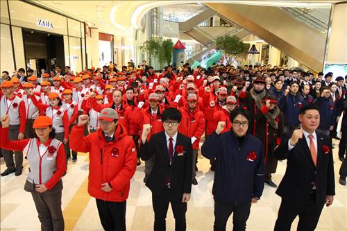 (서울=연합뉴스) 신호경 기자 = 롯데월드몰은 3일 오전 쇼핑몰 1층 아트리움 광장에서 보안·서비스 요원들을 대상으로 '친절교육'을 진행했다.