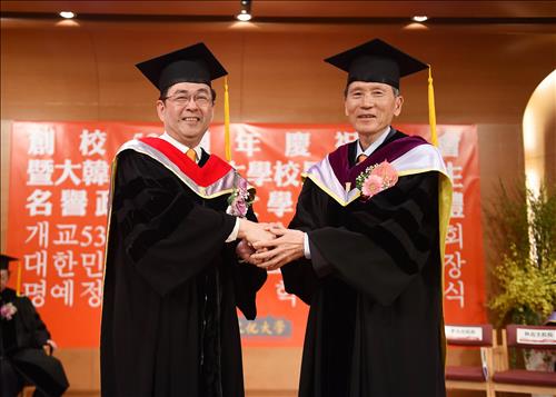 △ 박재규 경남대학교 총장(오른쪽)이 지난 1일 중국문화대학에서 장징후 이사장으로부터 명예 박사학위를 받고 있다.<<경남대학교 제공>>