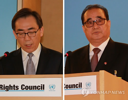 △ 남북, 유엔 인권이사회서 北 인권 놓고 격돌 (제네바=연합뉴스) 류현성 특파원 = 남북이 3일(현지시간) 스위스 제네바 유럽 유엔본부에서 열린 유엔 인권이사회에서 북한 인권문제를 둘러싸고 격돌했다. 북한 리수용 외무상(오른쪽)은 허위 증언에 기초한 반공화국 결의를 무효화해야 한다고 주장했고, 우리 정부 조태열 외교부 2차관(왼쪽)은 `손바닥으로 하늘을 가릴 수 없는 법'이라며 북한 당국의 반인도주의적 인권유린 행위 즉각 중단을 촉구했다. 2015.3.4 rhew@yna.co.kr