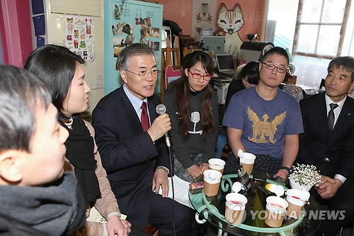 | △ 문재인 대표와 청년 창업자들 (전주=연합뉴스) 최영수 기자 = 문재인 새정치민주연합 대표가 4일 오후 전북 전주시 남부시장 내 청년몰에서 성공한 청년 창업자들을 격려하고 있다. 2015.3.4 kan@yna.co.kr |