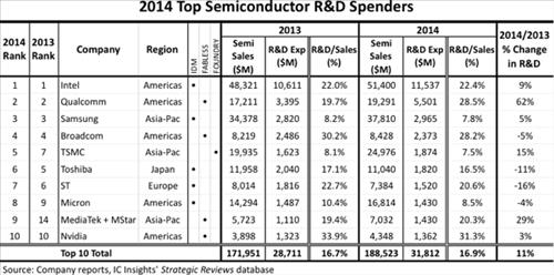 4일 시장조사기관 IC인사이츠에 따르면 지난해 반도체 R&D 지출 상위 10개사를 꼽아본 결과 인텔이 115억3천700만 달러로 1위, 퀄컴이 55억100만 달러로 2위였다.