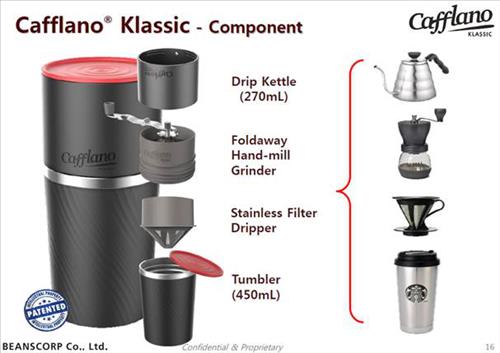 4일 업계에 따르면 국내 업체인 빈스코프가 지난해 개발한 '카프라노 클래식'은 드립커피를 만드는 기구들이 450㎖ 크기의 텀블러 안에 모두 들어가 있다.