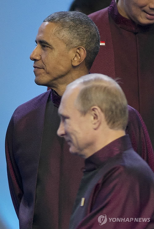 △ 버락 오바마 미국 대통령이 우크라이나 사태와 관련 러시아에 취한 제재 조치를 1년 더 연장하기로 결정한 것으로 알려졌다. 사진은 블라디미르 푸틴 러시아 대통령(앞쪽)과 버락 오바마 미국 대통령 (AP=연합뉴스 자료사진)