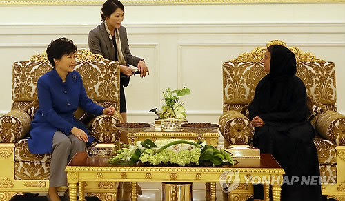 | △ 아랍에미리트 도착한 박 대통령 (아부다비=연합뉴스) 이정훈 기자 = 박근혜 대통령이 4일 오후(현지시각) 아랍에미리트 아부다비 왕실공항에 도착, 루브나 알-카시미 영예수행 장관의 영접을 받은 뒤 환담하고 있다. |