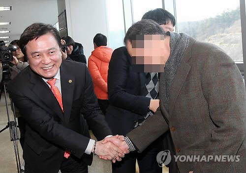 △ '감사합니다' (청주=연합뉴스) 김형우 기자 = 9일 청주지법 형사합의 11부(이관용 부장판사)로부터 기부행위 등 혐의(지방교육 자치에 관한 법률 위반)에 대해 무죄를 선고받은 김병우(왼쪽) 충북도교육감이 재판장을 나서며 자신의 지지자들과 악수를 하고 있다. 2015.2.9 vodcast@yna.co.kr