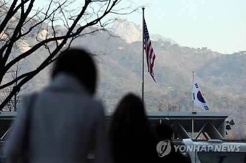 △ 리퍼트 미대사 테러..한미관계 위기 오나 (서울=연합뉴스) 신준희 기자 = 마크 리퍼트 주한 미대사에 대한 테러 사건이 발생한 5일 오전 서울 종로구 주한미국대사관에 걸린 성조기와 역사박물관 앞 태극기가 함께 보이고 있다.