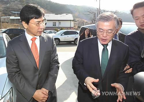 | △ 문재인과 안희정 (세종=연합뉴스) 이재림 기자 = 새정치민주연합 문재인 대표와 안희정 충남도지사가 5일 오전 세종특별자치시 금남면 한 갤러리에 들어서며 이야기를 나누고 있다. |