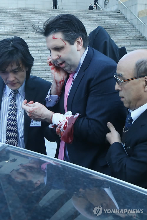△ 괴한 공격당한 마크 리퍼트 주한 미 대사 (서울=연합뉴스) 김주성 기자 = 마크 리퍼트 주한 미대사가 5일 오전 서울 세종문화회관에서 열린 민화협 주최 초청 강연에 참석했다가 괴한의 공격을 받고 피를 흘리며 병원으로 향하고 있다. 2015.3.5 utzza@yna.co.kr