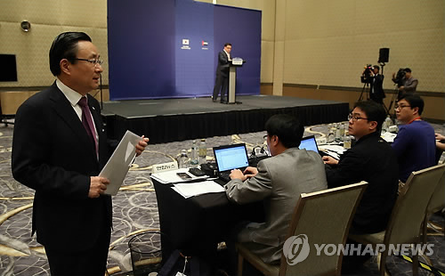 | △ 질문받는 주철기 외교안보 수석 (아부다비=연합뉴스) 도광환 기자 = 주철기 청와대 외교안보 수석이 5일 오전(현지시간) 아랍에미리트 아부다비 기자실에서 브리핑을 마친 뒤 리퍼트 주한 미국대사 피습사건에 대한 대응책 등을 질문받고 있다. |