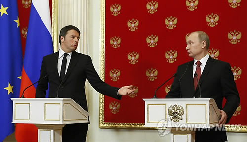 | △ (AP=연합뉴스) 마테오 렌치 이탈리아 총리(왼쪽)가 5일(현지시간) 러시아 모스크바에서 블라디미르 푸틴 대통령과 회동한 뒤 공동기자회견을 하고 있다. 렌치 총리는 우크라이나 사태로 인해 틀어진 서방과 러시아 간의 관계를 회복하기 위한 노력의 일환으로 러시아를 방문했다. |