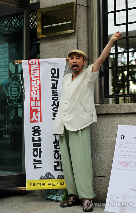 | △ 지난 2010년 외교통상부 앞에서 일본의 독도영유권 주장에 반대하는 1인 시위를 하는 김기종 씨. (연합뉴스 자료사진) |