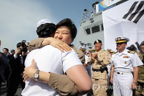 | △ 박 대통령, UAE 장병 격려 (아부다비=연합뉴스) 이정훈 기자 = 박근혜 대통령이 6일 오전(현지시간) 아랍에미리트 아부다비 자이드항에 정박중인 대조영함과 왕건함을 방문, 해군 청해부대 장병들을 격려한 뒤 여군 하사관과 포옹하고 있다. |