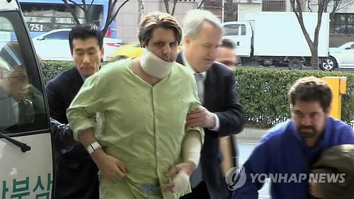 | △ 5일 오전 흉기 습격을 당한 마크 리퍼트 주한 미국 대사가 서울 서대문구 신촌세브란스 병원으로 들어가고 있다. (연합뉴스TV) |