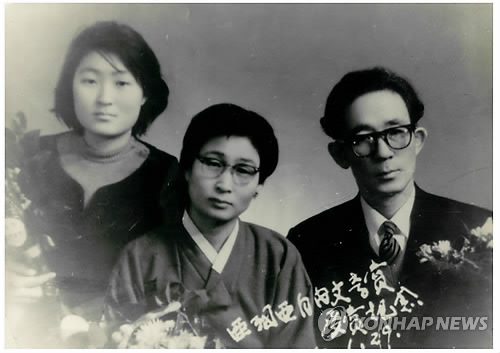 △ 울산 오영수문학관 특별전…미공개 사진 공개 (울산=연합뉴스) 장영은 기자 = 울산시 울주군 오영수문학관이 개관 1주년을 맞아 오영수 선생의 특별전을 개최한다. 오는 28일부터 4월 26일까지 열리는 특별전에서는 오 선생의 데스마스크(망인의 얼굴을 본떠 만든 안면상)와 미공개 사진 등을 처음 전시한다.사진은 아세아자유문학상을 수상한 뒤 부인 김정선 여사와 큰 딸 오숙희씨와 함께 찍은 기념사진. 2015.3.8 << 오영수문학관 제공 >> young@yna.co.kr
