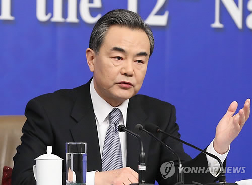 | △ 왕이 중국 외교부장 내외신 기자회견 (베이징=연합뉴스) 이준삼 특파원 = 왕이(王毅) 중국 외교부장이 전국인민대표대회(전인대) 기간인 8일 베이징(北京) 미디어센터에서 내외신 기자회견을 열고 북중관계를 비롯한 중국의 대외정책을 설명하고 있다. 2015.3.8 jslee@yna.co.kr |