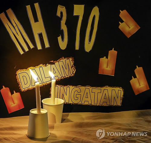 | △ (EPA=연합뉴스) 6일(현지시간) 말레이시아 페탈링자야에서 열린 말레이시아항공 MH370편 실종사고 희생자 추모 집회에 플래카드와 촛불이 놓여 있다. epa04650699 A placard reading 'In memory of MH370' is seen during a vigil in Petaling Jaya, outside Kuala Lumpur, Malaysia, 06 March 2015. The vigil was held to commemorate the passengers and crews of the missing Malaysia Airlines Flight MH370. 08 March 2015 will mark one year since the disappearance of Malaysia Airlines flight MH370, while en route from Kulala Lumpur, Malaysia to Beijing, China. The Boeing 777-200 plane was carrying 227 passengers and a crew of 12. The most extensive search in aviation history has yielded no sign of flight MH370, with no debris found on the surface. Malaysia has declared the disappearance of MH370 an accident and said all aboard are presumed dead. EPA/AZHAR RAHIM |