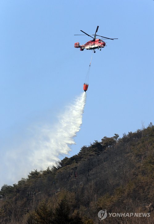 △ 물뿌리는 헬기 (고성=연합뉴스) 이종건 기자 = 8일 강원 고성군 죽왕면 구성리에서 발생한 산불진화에 투입된 헬기가 물을 뿌리고 있다. 2015.3.8 momo@yna.co.kr
