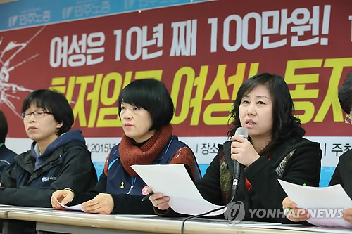 △ 지난 5일 오전 서울 정동 민주노총에서 열린 '최저임금 여성노동자 증언 기자회견'에서 이현숙 공공운수노조 전국교육공무직본부 경기지부 급식분과장(마이크 든 이)이 발언하고 있다.