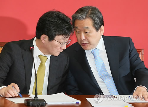 △ 김무성 유승민 대화 (서울=연합뉴스) 진성철 기자 = 새누리당 김무성 대표(오른쪽)와 유승민 원내대표가 9일 국회에서 열린 최고위원회의에서 대화하고 있다.