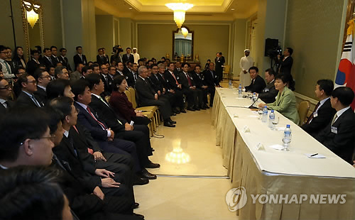 | △ 박근혜 대통령이 지난 8일 오후(현지시각) 도하 시내 한 호텔에서 열린 중동 4개국 방문 수행 경제사절단과의 간담회에서 인사말을 하고 있다. |