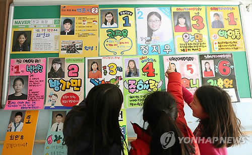 | △ 대구 북구의 한 초등학교에서 학생들이 전교어린이회장·부회장 선거 출마 후보자들의 인적사항과 공약을 살펴보고 있다. (연합뉴스 자료사진) |