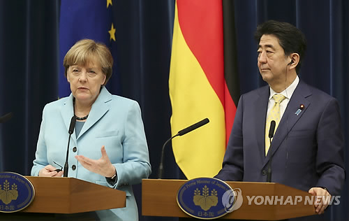 △ (AP=연합뉴스) 일본을 방문 중인 앙겔라 메르켈 독일 총리(왼쪽)가 9일 도쿄의 총리 관저에서 아베 신조 일 총리와 공동 기자회견을 하고 있다.