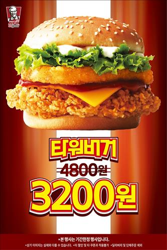 (서울=연합뉴스) 신호경 기자 = KFC(www.kfckorea.com)가 12일부터 19일까지 '타워버거'를 정상가(4천800원)보다 33% 싼 3천200원에 판매한다.
