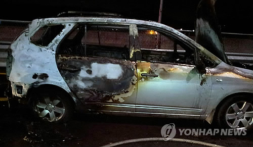 △ 승합차 화재로 운전자 숨져 (울산=연합뉴스) 11일 오후 울산시 남구 국도 14호선을 달리던 카렌스 승합차에서 불이 나 50대 운전자가 숨졌다. 2015.3.11 << 울산시소방본부 >> hkm@yna.co.kr