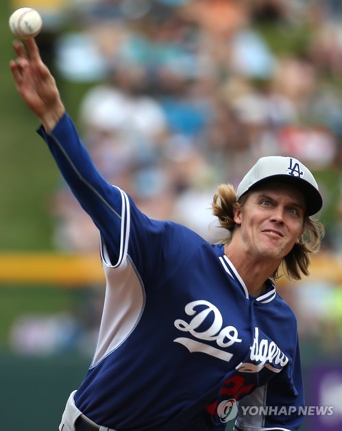 | △ 시범경기 공식 첫 등판한 그레인키 (메사<미국 애리조나>=연합뉴스) 황광모 기자 = 12일 미국 애리조나 메사 슬로언 파크에서 열린 미국 MLB 시범경기 LA 다저스와 시카고 컵스와의 경기에서 LA 선발 잭 그레인키가 1회말 역투하고 있다. 2015.3.12 hkmpooh@yna.co.kr |