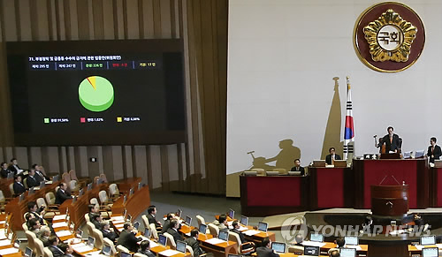 | △ 3일 오후 국회에서 열린 제331회 국회(임시회) 제8차 본회의에서 '부정청탁 및 금품 등 수수의 금지에 관한 법률안'이 통과되고 있다. |