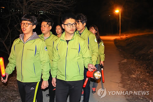 △ "학우들 안전, 우리가 지킵니다" (경산=연합뉴스) 이강일 기자 = 대구대 학생들이 무술유단자 등으로 구성된 자율방범대를 구성해 밤 시간 학교주변 등에 대한 순찰에 나섰다. 자율방범대는 밤늦게 귀가하는 학생이 원하면 집까지 동행하는 서비스도 제공한다. 2015.3.12 <<대구대>> leeki@yna.co.kr