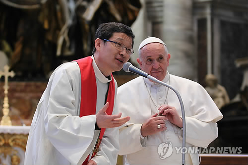 | △ 한국 신자들에게 인사하는 프란치스코 교황 (서울=연합뉴스) 황희경 기자 = 프란치스코 교황이 12일(현지시간) 바티칸 성 베드로 대성당에서 열린 124위 시복 감사미사에 앞서 한국 신자들에게 인사하고 있다. 교황 왼쪽은 통역을 맡은 한국 천주교 주교회의 홍보국장 이정주 신부. (카톨릭신문 제공) |