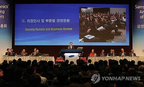 | △ 인사말 하는 권오현 의장 (서울=연합뉴스) 박지호 기자 = 13일 오전 서울 삼성전자 서초사옥에서 열린 '삼성전자 정기 주주총회'에서 권오현 의장(삼성전자 부회장)이 인사말을 하고 있다. |