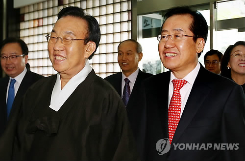 | △ 함께 걷는 경남·북지사 (대구=연합뉴스) 김준범 기자 = 김관용 경북도지사(왼쪽)와 홍준표 경남도지사가 13일 오후 대구 북구 경상북도청 접견실로 향하고 있다. 이날 양도는 퇴계·남명사상 교류 촉진을 위한 상호 협약을 체결했고 향후 문화사업을 확대하는데 협력할 방침이다. 2015.3.13 psykims@yna.co.kr |
