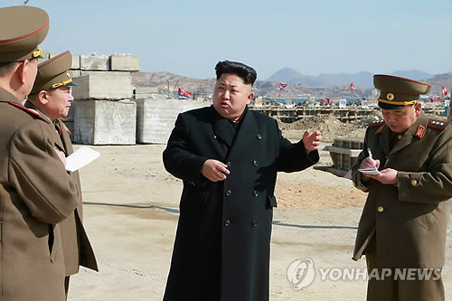 | △ 북한 김정은, 동해 원양어업기지 시찰 (서울=연합뉴스) 김정은 북한 국방위원회 제1위원장이 동해안의 원양어업기지인 '5월27일수산사업소' 건설 현장을 시찰했다. 노동신문이 14일 게재한 관련 사진에는 김 제1위원장이 군 간부들을 거느리고 건설장을 둘러보는 모습이 담겼다. 2015.3.14 nkphoto@yna.co.kr |