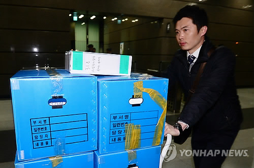 | △ 검찰 '비자금 의혹' 포스코건설 압수수색 (인천=연합뉴스) 윤태현 기자 = 검찰이 거액의 비자금을 조성했다는 의혹으로 포스코건설에 대한 수사에 착수한 지난 13일 인천시 연수구 포스코건설 건물에서 압수수색을 마친 검찰 수사관들이 압수품을 가지고 나오고 있다. |
