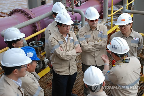 | △ 플랜트 현장 시찰 나선 국회 자원특위 워원들 (요하네스버그=연합뉴스) 류일형 특파원 = 국회 자원특위 위원들이 지난 13일(현지시간) 마다가스카르 항구도시 토아마시나 암바토비 플랜트내 제련공장에서 관계자로부터 니켈 생산공정에 대해 설명을 듣고 있다. (광물자원공사 제공) |