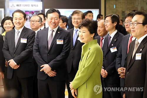 | △ 부산창조경제혁신센터 시찰하는 박 대통령 (부산=연합뉴스) 도광환 기자 = 박근혜 대통령이 16일 오전 부산 해운대구 센텀그린타워에서 열린 부산창조경제혁신센터 개소식에 참석해 신동빈 롯데그룹 회장, 서병수 부산시장 등과 함께 센터를 시찰하고 있다. 2015.3.16 dohh@yna.co.kr |