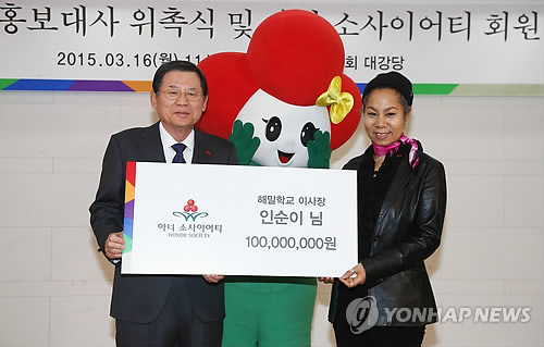 | △ (서울=연합뉴스) 홍기원 기자 = 가수 인순이(오른쪽)가 16일 오전 서울 중구 정동 사회복지공동모금회 대강당에서 열린 '홍보대사 위촉식 및 아너 소사이어티 회원 가입식'에서 허동수 사회복지공동모금회 회장에게 기부금을 전달한 후 기념촬영을 하고 있다. 2015.3.16 xanadu@yna.co.kr |