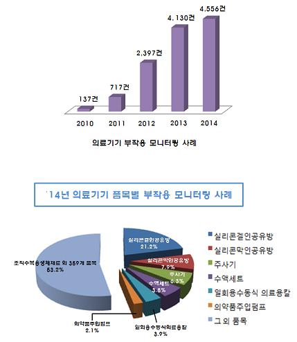 부작용 사례가 확인된 의료기기 품목도 2011년 105개, 2012년 284개, 2013년 372개, 2014년 366개로 다양해지는 추세다.