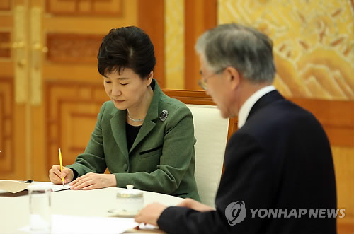 △ 발언하는 문재인, 메모하는 박근혜 (서울=연합뉴스) 도광환 기자 = 17일 오후 청와대에서 열린 여야대표 회동에서 새정치민주연합 문재인 대표가 발언하자 박근혜 대통령이 메모하고 있다.