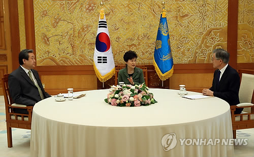△ 대화하는 박 대통령과 여야 대표 (서울=연합뉴스) 도광환 기자 = 박근혜 대통령과 새누리당 김무성 대표, 새정치민주연합 문재인 대표가 17일 오후 청와대에서 열린 여야대표 회동에서 대화하고 있다.