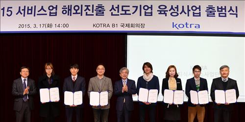 코트라는 17일 서울 서초구 사옥에서 '2015년 서비스산업 선도기업 육성사업' 출범식을 열고 서비스사업 해외진출 선도기업 육성사업을 중국, 유럽연합(EU) 등 FTA 체결국가로 확대해 추진키로 했다고 18일 밝혔다.