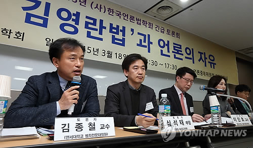 | △ 토론회 '김영란 법과 언론의 자유' (서울=연합뉴스) 최재구 기자 = 18일 서울 프레스센터에서 한국언론법학회 주최로 열린 토론회 '김영란법과 언론의 자유'에서 김종철 연세대 법학전문대학원 교수가 발표하고 있다. 2015.3.18 jjaeck9@yna.co.kr |