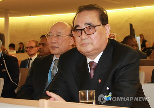 △ 북한 리수용 외무상이 지난 3일 스위스 제네바에서 열린 유엔 인권이사회에서 기조연설을 앞두고 자리에 앉아 있다. 리 외무성은 이 연설에서 유엔 인권결의안의 기초가 된 탈북자 신동혁씨의 주장이 거짓으로 드러나 인권결의안도 무효가 됐다고 주장했다. <<연합뉴스DB>>